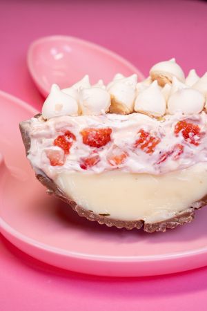 Sabor: Chocolate ao leite com recheios de banoffee (doce de leite cremoso artesanal, bananas selecionadas e chantilly levinho) e monoffee (leite condensado cremoso, morangos frescos, chantilly levinho e suspiros).