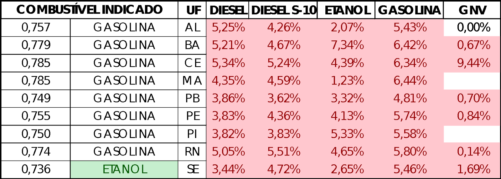 O valor médio mais alto da gasolina foi registrado em Alagoas, onde o combustível foi comercializado a R$ 5,278 nos postos. No Estado, o diesel, a R$ 4,212, e o diesel S-10, a R$ 4,256, também apresentaram os preços mais caros da Região. Já o litro médio mais caro do etanol foi encontrado no Rio Grande do Norte, a R$ 4,050, e do gás natural veicular (GNV), no Ceará, a R$ 3,721.