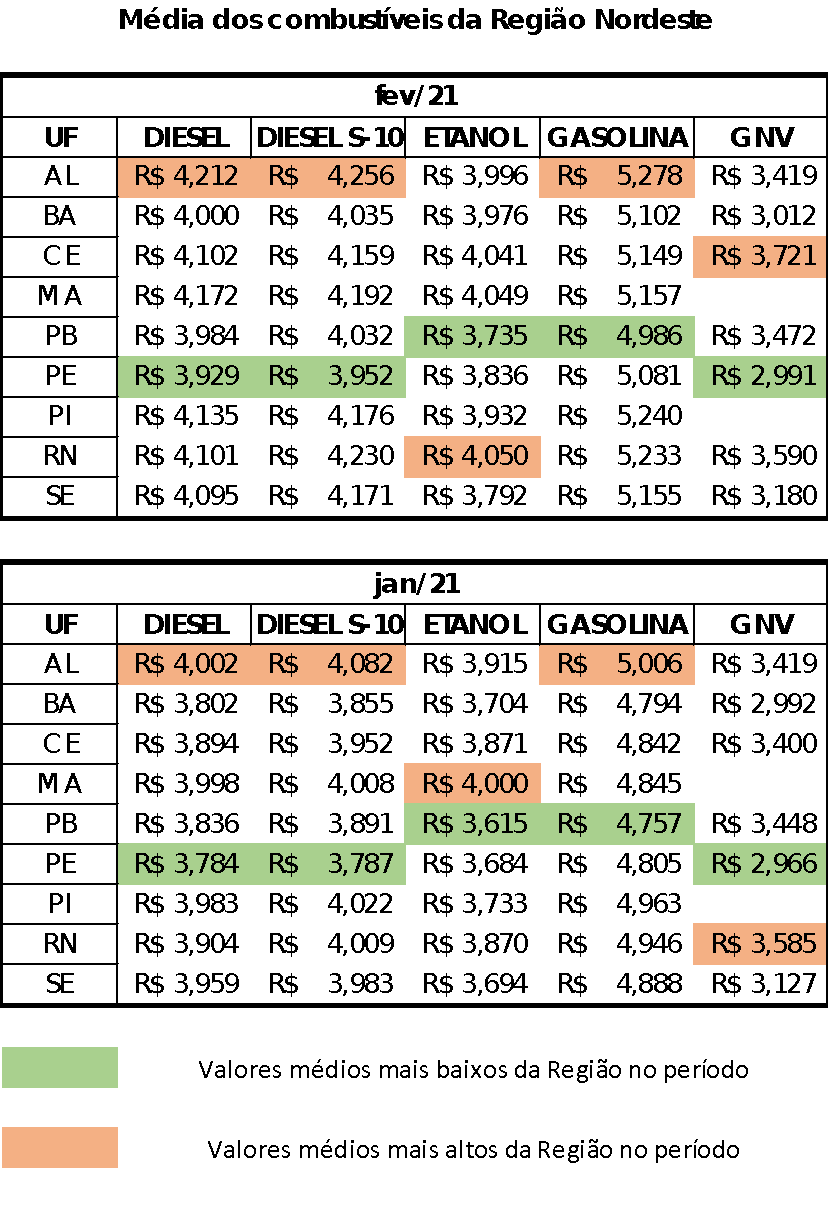 Os combustíveis mais baratos em fevereiro foram registrados em Pernambuco e na Paraíba. Nos postos paraibanos, tanto a gasolina, a R$ 4,986, quanto o etanol, a R$ 3,735, apresentaram os menores preços. O diesel e o diesel S-10 mais baratos foram encontrados nos postos pernambucanos, a R$ 3,929 e R$ 3,952, respectivamente, bem como o GNV, a R$ 2,991.